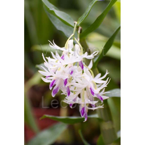 Grappes retombantes portant des fleurs de couleur blanche au labelle violet améthyste.