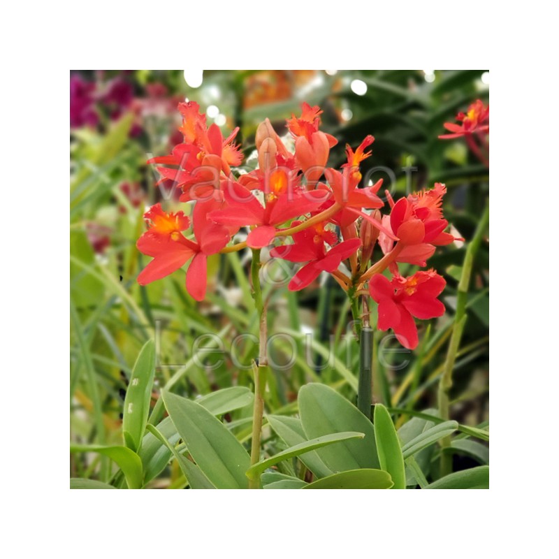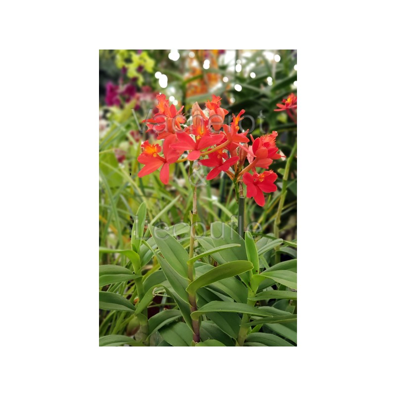 Orchidée dépourvue de pseudobulbes formant, avec l'âge, des touffes denses de tiges garnies sur toute leur longueur de petites feuilles coriaces. Hampe florale terminale un bouquet de nombreuses fleurs de 4cm de diamètre, de couleur rouge vif. Petit labelle frangé rouge éclairé d'une pointe de jaune. Les fleurs, considérées individuellement, ont une durée de vie assez courte mais la plante produit des boutons floraux sur le même bouquet pendant de longues semaines