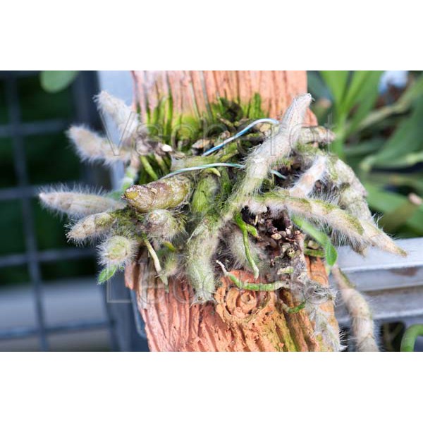 Fleurs jaunes apparaissant sur les pseudobulbes défoliés. Espèce caractérisés par ses feuilles et ses pseudobulbes couverts de poils blancs. Espèce réclamant un repos prononcé l'hiver (arrosages limités au strict minimum pour éviter la déshydratation complète des pseudobulbes).