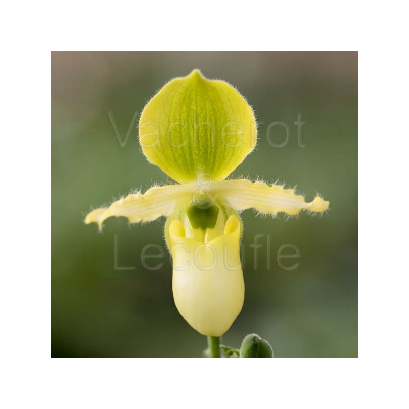 Espèce produisant des fleurs successives sur la même hampe florale. Pavillon jaune vert, pétales et labelle jaune.