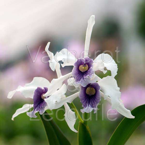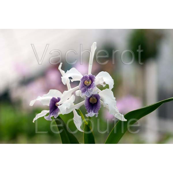 Grandes fleurs de couleur blanche au labelle mauve bleuté. Les fleurs sont bien dégagées au-dessus du feuillage.