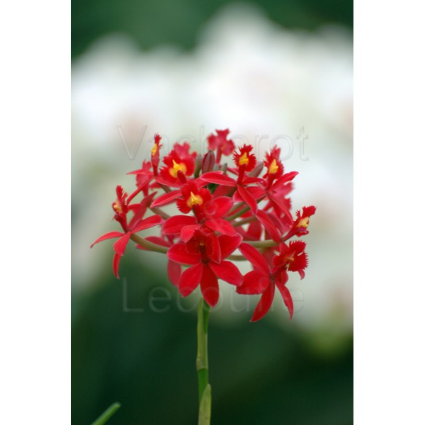 Description : Orchidée dépourvue de pseudobulbes formant, avec l'âge, des touffes denses de tiges de 50cm de haut garnies sur toute leur longueur de petites feuilles coriaces. Hampe florale terminale de 20cm de haut portant un bouquet de nombreuses fleurs de 4cm de diamètre, de couleur rouge vif. Petit labelle frangé rouge éclairé d'une pointe de jaune. Les fleurs, considérées individuellement, ont une durée de vie assez courte mais la plante produit des boutons floraux sur le même bouquet pendant de longues semaines