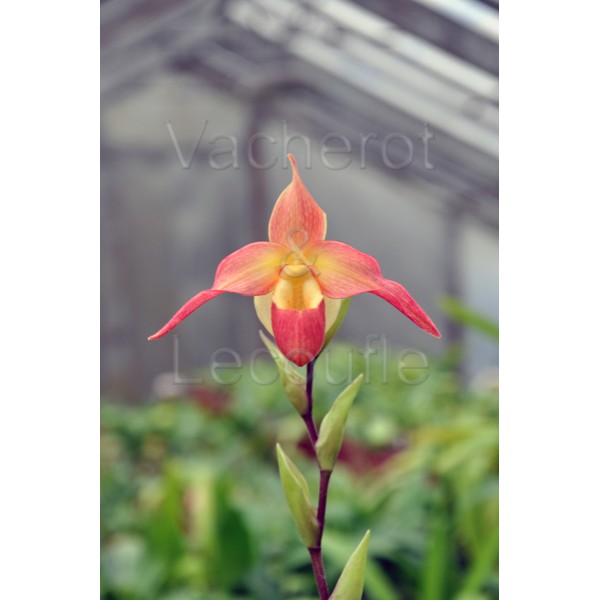 Belle plante sans pseudobulbe au feuillage rubanné abondant, ressemblant à un Paphiopedium géant à feuilles longues. Forme assez rapidement des touffes importantes composées de nombreuses pousses étroitement serrées les unes contre les autres. Hampe portant des fleurs successives de 11cm mêlant subtilement le vieux rose, le pêche et le jaune.