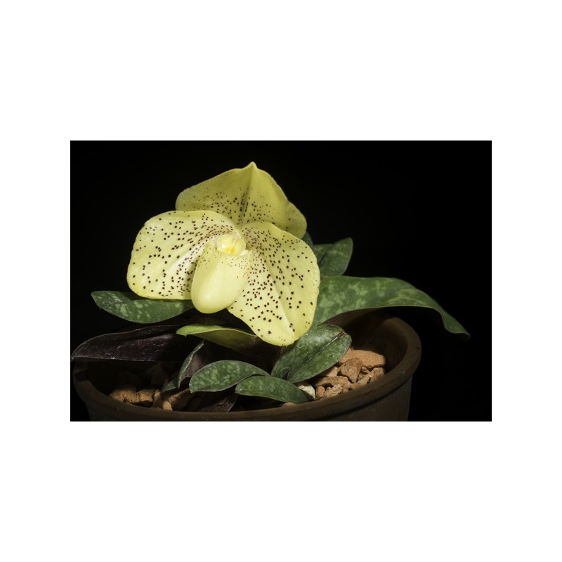 Orchidée miniature. Tige florale courte portant 1 ou 3 fleurs crème abondamment mouchetées de grenat.