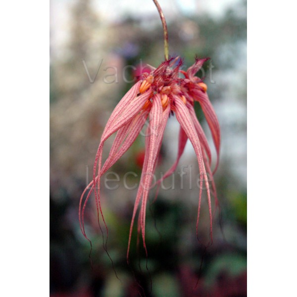 Plante de 10cm de haut présentant des pseudobulbes ronds, espacés sur le rhizome et portant une feuille unique. Hampe florale érigée de 25cm portant des fleurs de 15cm en forme de doigt, de couleur vieux rose strié de rose plus soutenu, regroupées en parapluie.