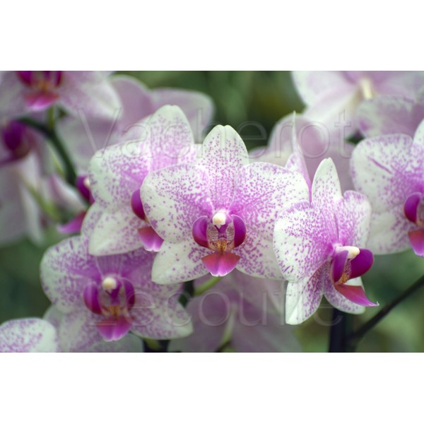Hampes de ramifiées, portant des fleurs rondes, blanches délicatement mouchetées de rose indien et agrémentées d'un aplat de la même couleur. Labelle rouge.