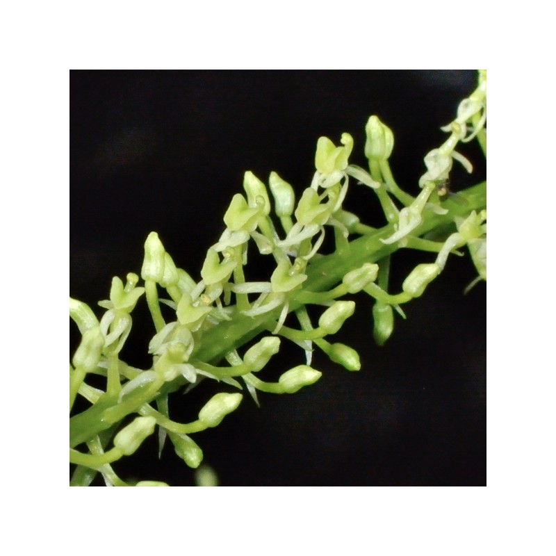 Plante très vigoureuse de 30cm à 40cm de haut environ présentant des pseudobulbes ovoïdes portant chacun deux feuilles. Hampes cylindriques en forme de rince-bouteille arqué de 20/25cm de long portant d'innombrables petites fleurs vertes.