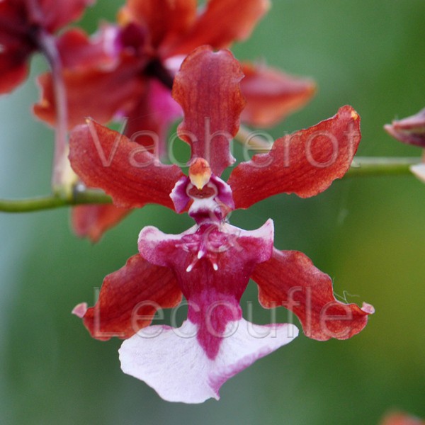 Orchidée dont les longues tiges ramifiées portent une multitude de petites fleurs de 3cm de diamètre, de couleur grenat au labelle blanc marqué de mauve. Cet hybride est susceptible de fleurir plusieurs fois dans l'année.