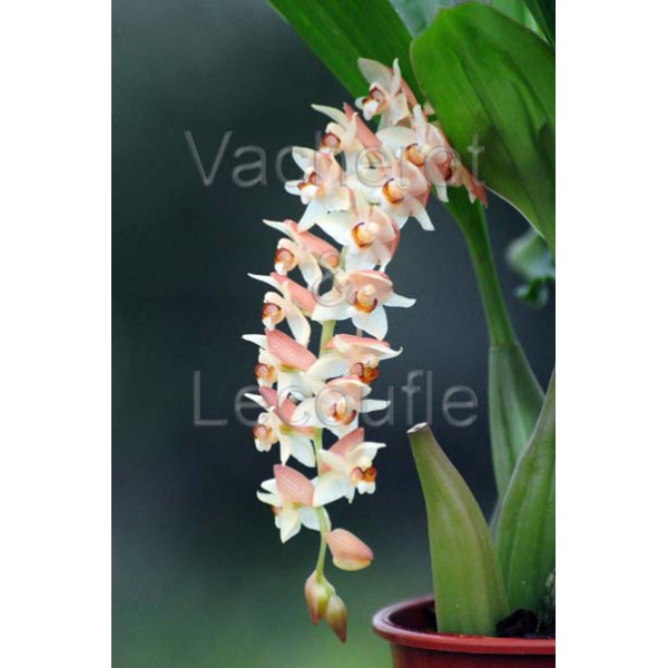Grappes retombantes de fleurs de 2cm de couleur blanche légèrement teintées de rose. Revers de pétales teinté de rose.
