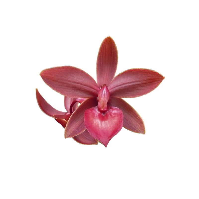 Orchidée de 30cm à 40cm de haut présentant des pseudobulbes fusiformes habillés de bractées sèches et portant à leur tiers supérieur des feuilles tendres et plissées. La tige florale en haut des pseudobulbes venant d'achever leur croissance et porte jusqu'à 10 fleurs cireuses et étoilées de 8cm, de couleur rouge sombre.