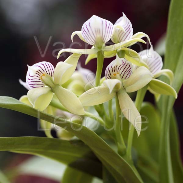 Tiges florales portant de 5 à 10 fleurs crème au labelle blanc rayé de violet en forme de coquille.