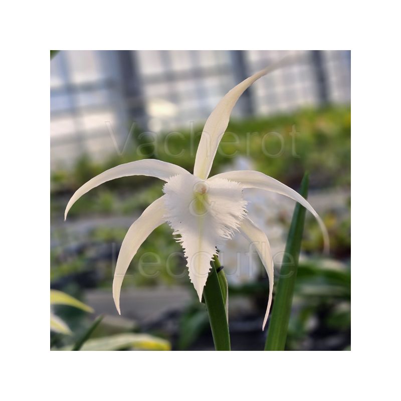 Plante proche d'un Brassvola survitaminé. Tige florale portant jusqu'à 3 fleurs de 17cm au longs pétales et sépales retombants légèrement vers l'arrière. A l'ouverture, les fleurs sont crèmes puis se teintent légèrement d'un soupçon de rose orangé lorsqu'elles approchent de la fanaison.