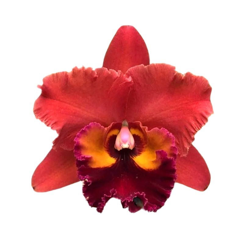 Variété à la croissance vigoureuse. Grandes fleurs rouge corail. Labelle pourpre velouté au coeur orangé.