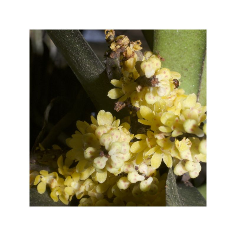 Feuilles coriaces, larges et rubannées en éventail alignées sur un plan le long de la tige courte de la plante (croissance lente). Hampe florale pendante de 15/20cm, parfois ramifiée, portant de nombreuses petites fleurs cireuses jaunes maculées de rouge.