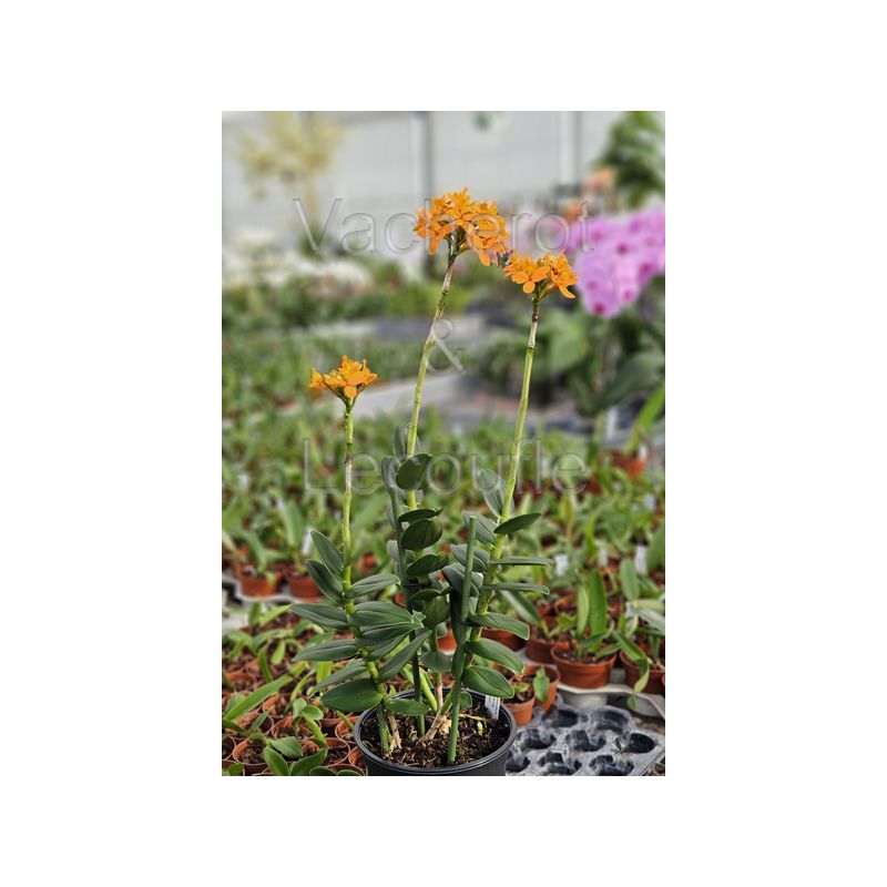 Orchidée dépourvue de pseudobulbes formant, avec l'âge, des touffes denses de tiges de 50/60cm de haut garnies sur toute leur longueur de petites feuilles coriaces. Hampe florale terminale de 20cm de haut portant un bouquet de nombreuses fleurs de 4cm de diamètre, de couleur orange vif.