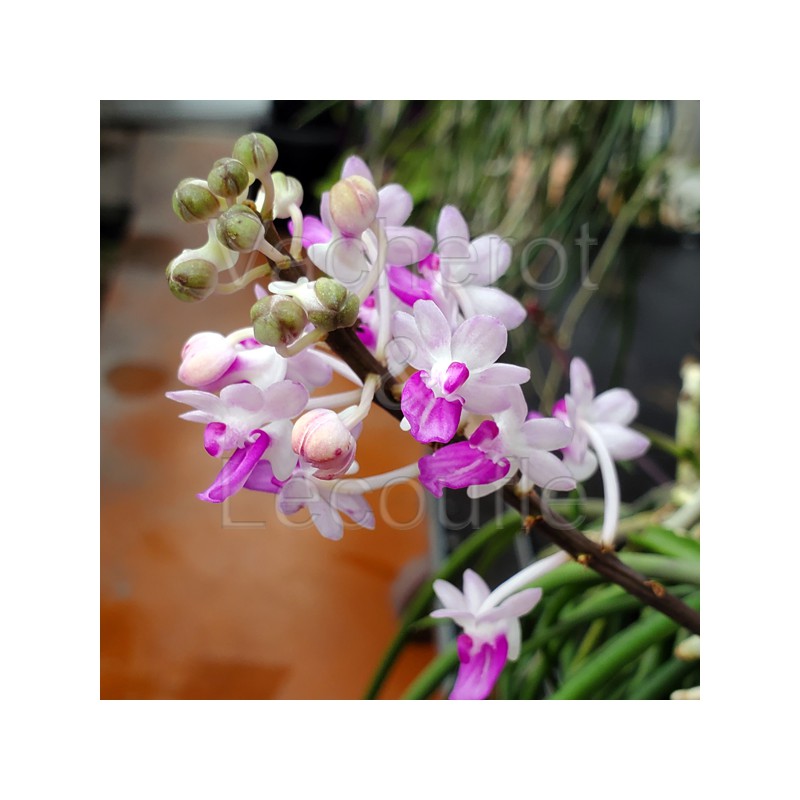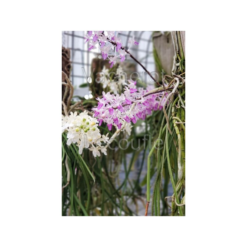 Orchidée au port retombant et au feuillage cylindrique. Tige florales latérales et érigées portant de nombreuses fleurs cireuses et odorantes de couleur crème au labelle améthyste. Orchidée ressemblant à un Paraphalaenopsis.