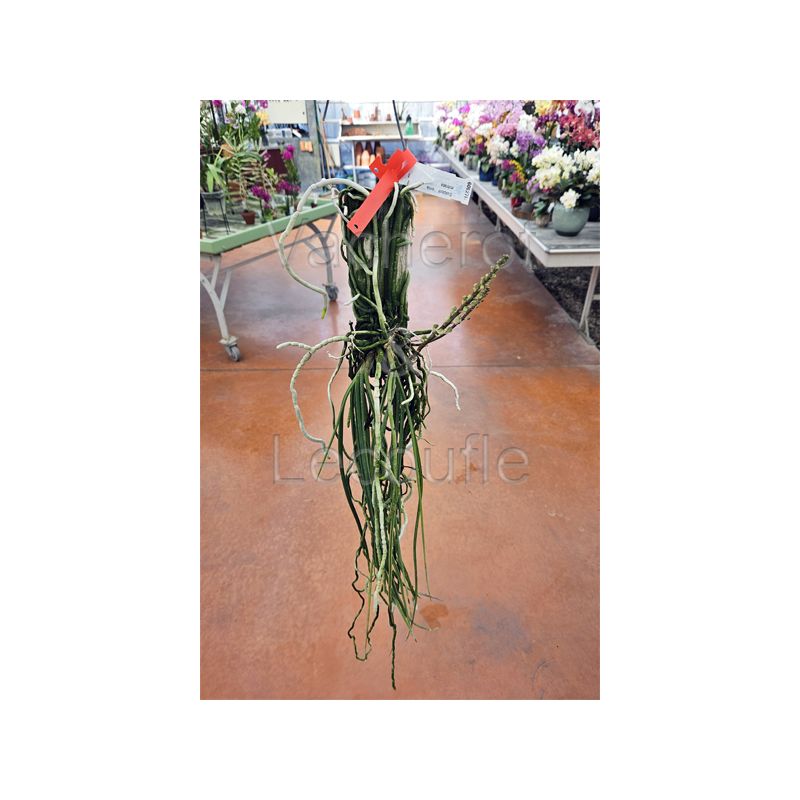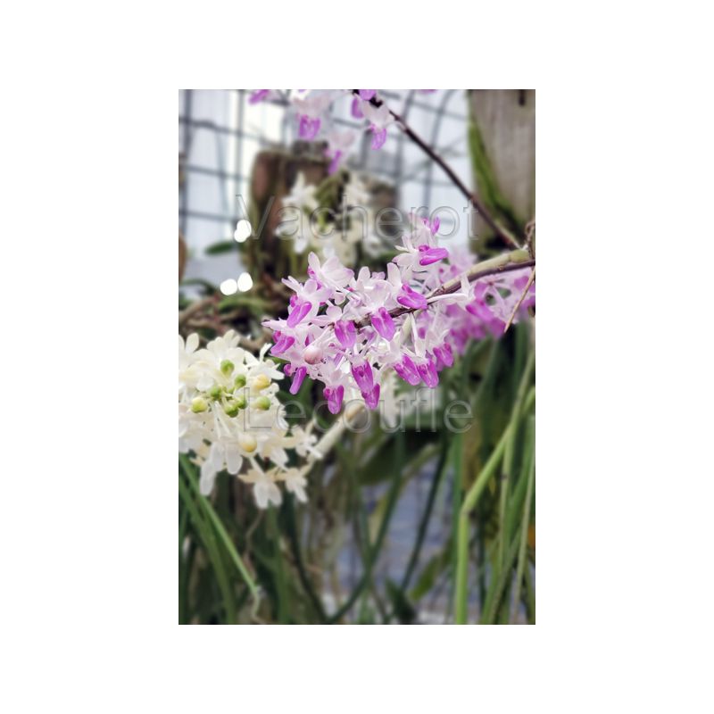Orchidée au port retombant et au feuillage cylindrique. Tige florales latérales et érigées portant de nombreuses fleurs cireuses et odorantes de couleur crème au labelle améthyste. Orchidée ressemblant à un Paraphalaenopsis.