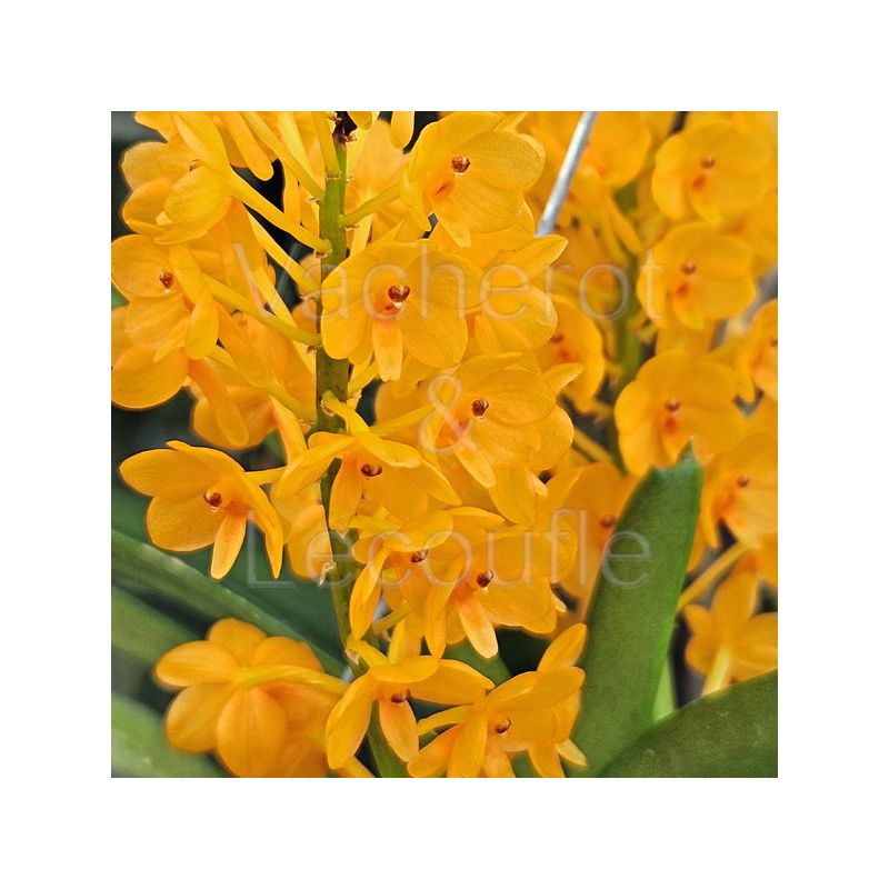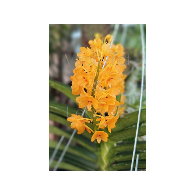 Tiges florales latérales érigées portant de nombreuses petites fleurs lumineuses orange vif. Orchidée ressemblant à un vanda miniature.