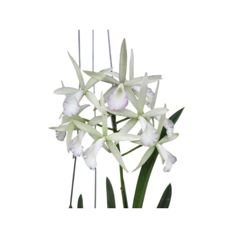 Bouquets de fleurs parfumées de blanc crème. Labelle tubulaire ourlé de rose. Le bouquet de fleurs est bien dégagé au dessus du feuillage.
