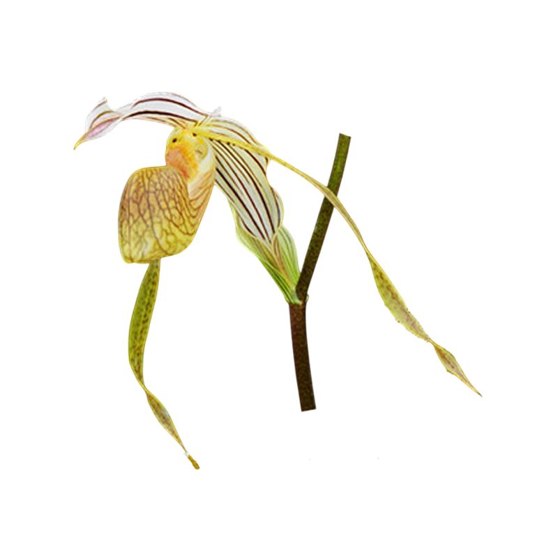 Espèce à la croissance vigoureuse proche de Paph. stonei. Sépales et pavillon blancs striés de bordeaux. Pétales latéraux bruns/verts, retombants et légèrement torsadés. Sabot brun/vert.