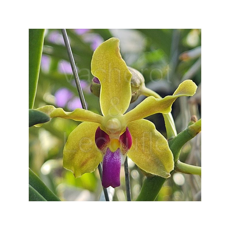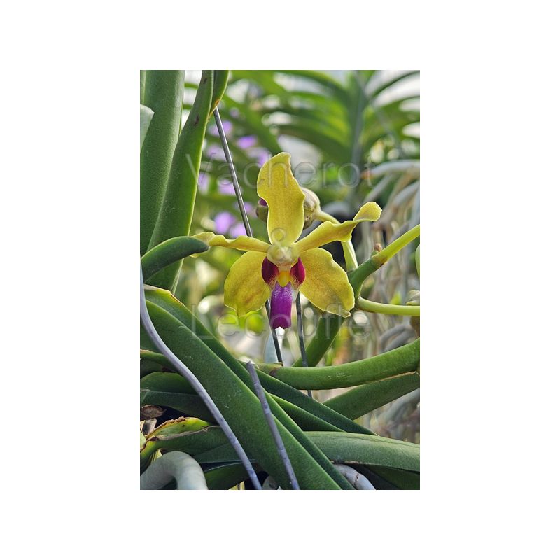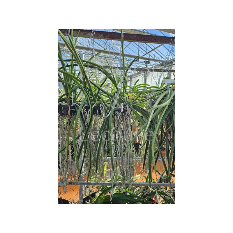 Orchidée à la végétation très vigoureuse, longues feuilles cylindriques au port plutût retombant. Tigres florales assez courtes portant des fleurs vert chartreuse au labelle violet.