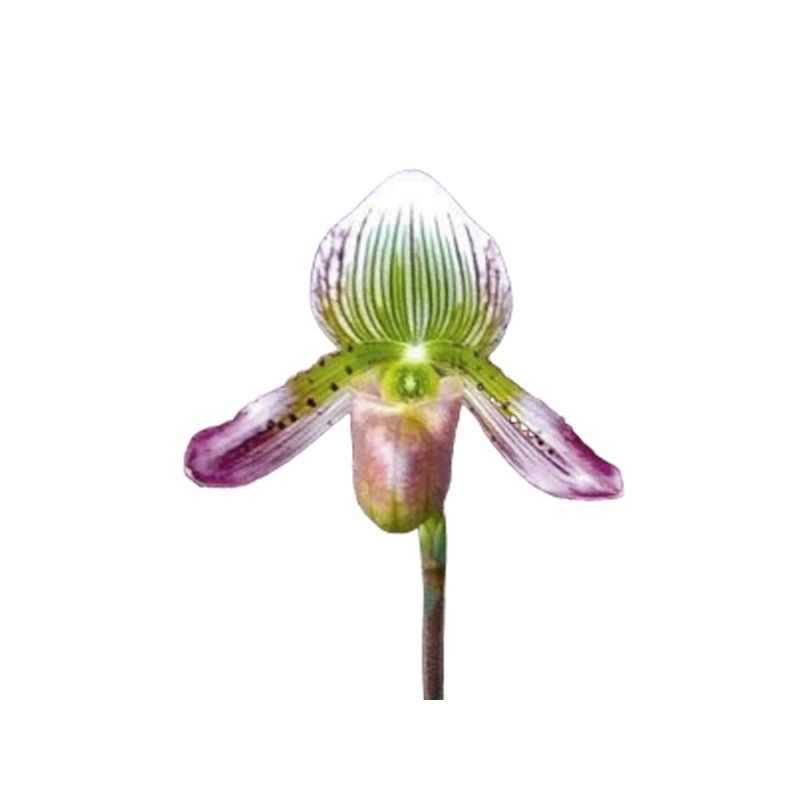 Grand pavillon blanc strié de vert et de pourpre. Pétales retombants verts et pourpre. Labelle vert et acajou clair. Feuillage vert foncé tesselé.