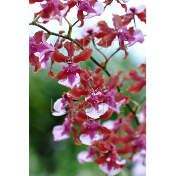 Orchidée dont les longues tiges ramifiées portent une multitude de petites fleurs de 3cm de diamètre, de couleur grenat au labelle blanc marqué de mauve. Cet hybride est susceptible de fleurir plusieurs fois dans l'année.