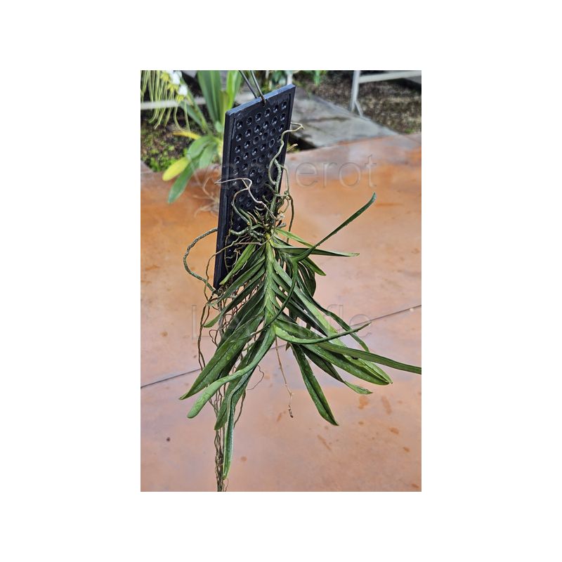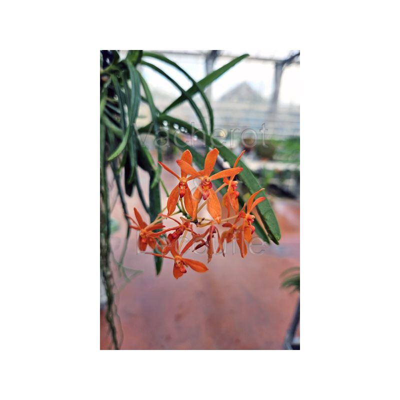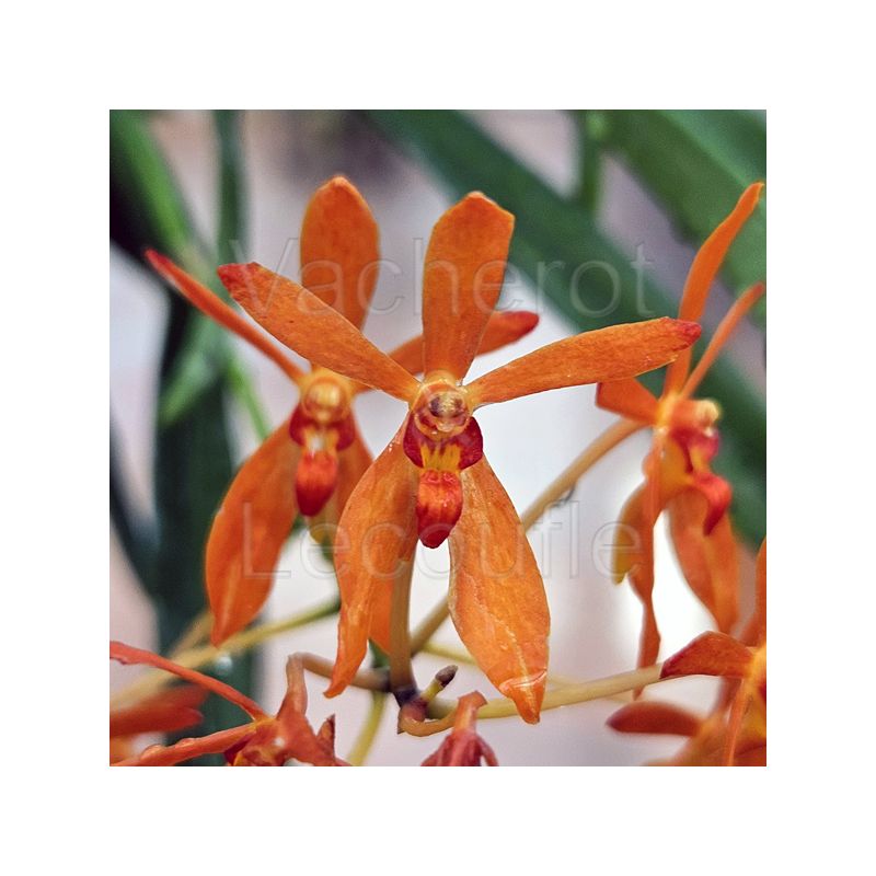 Orchidée ressemblant beaucoup à un petit Vanda. Tiges florales bien dégagées du feuillage portant de jolies fleurs étoilées orange vif.