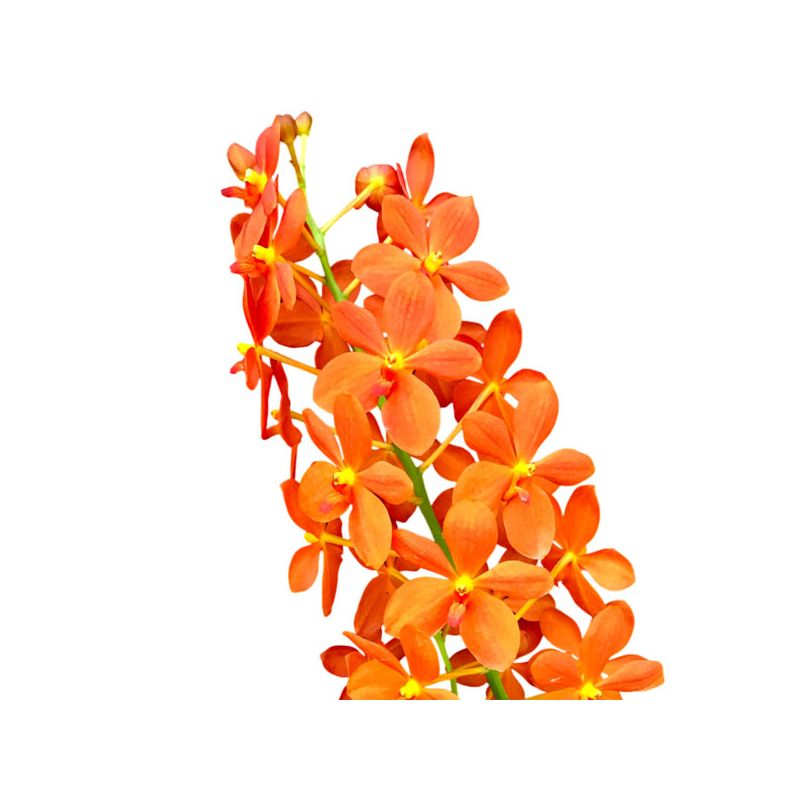 Orchidée similaire à une Vanda compacte. Tiges florales multiples, érigées et bien dégagées du feuillage. Les nombreuses fleurs orange vif ne passent pas inaperçues.