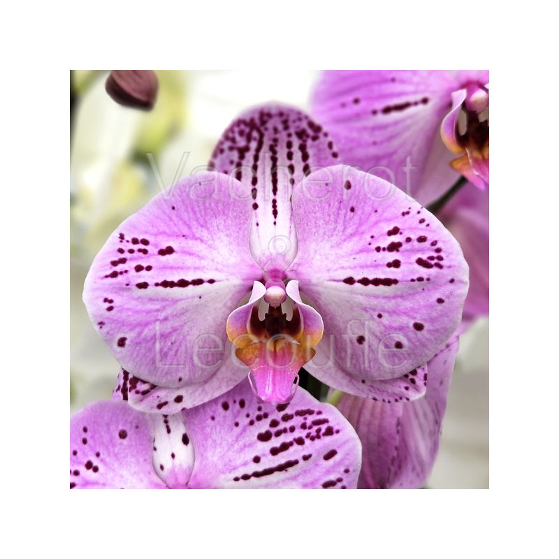 Grandes fleurs bien rondes à la délicate couleur rose agrémentée de splash grenats. Labelle rose vif réhaussé d'une pointe d'orange.