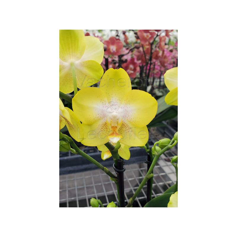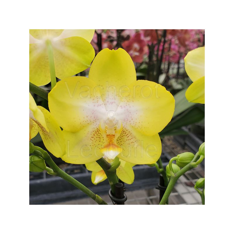 Hybride compact au grandes fleurs jaune vif avec le centre blanc. Très subtiles stries concentriques rouge se densifiant vers le centre de la fleur. Labelle orange,jaune et blanc. Une plante très lumineuse.