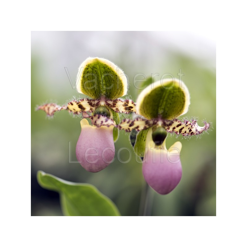 Plante moyenne à feuilles vertes, oblongues et rubannées. tige florale produisant de nombreuses fleurs successives. Pavillon brun vert bordé de blanc. Pétales crèmes pointillés de rose. Labelle rose.