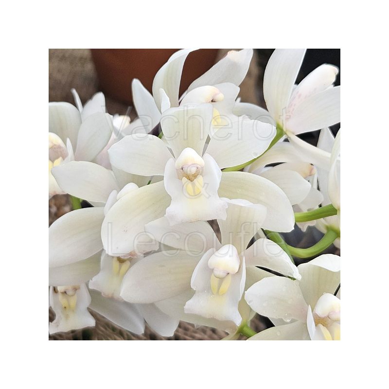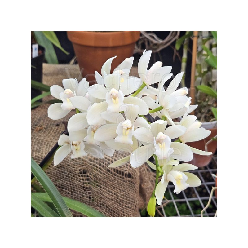 Cymbidium de climat frais aux longues feuilles rubanées. Fleurs crème au labelle blanc discrètement éclairé de jaune. Variété compacte.