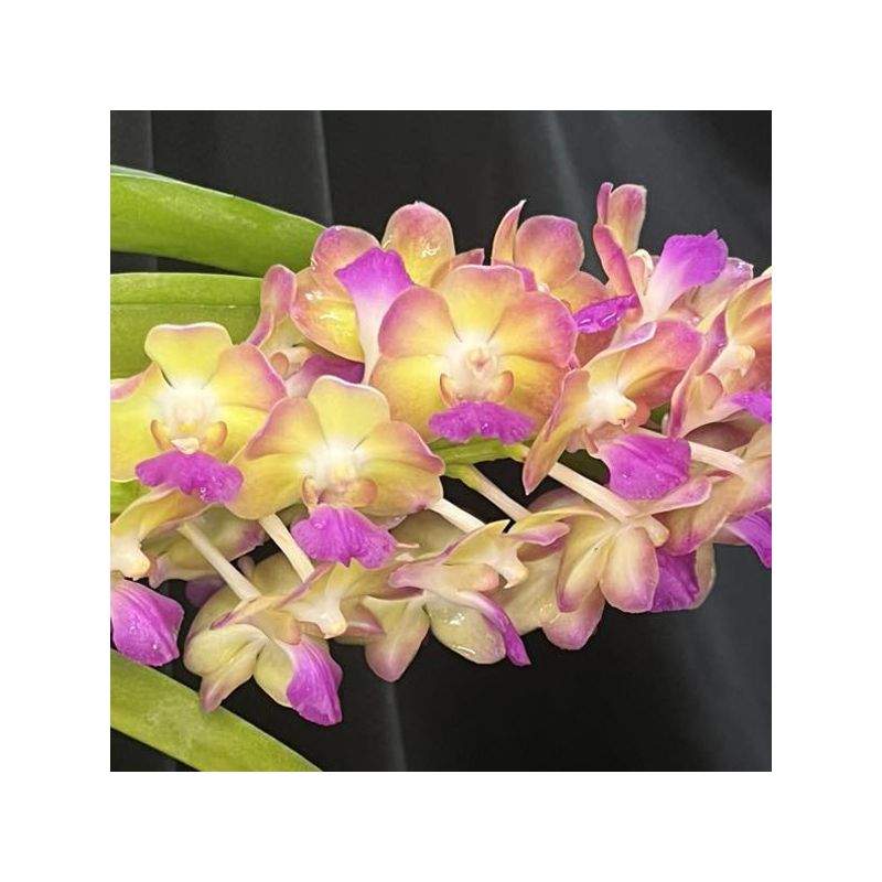 Orchidée ressemblant beaucoup à un Ascocentrum. Nombreuses fleurs jaunes discrètement ombrées de rose à l'extrémité des pétales. Labelle fuchsia.