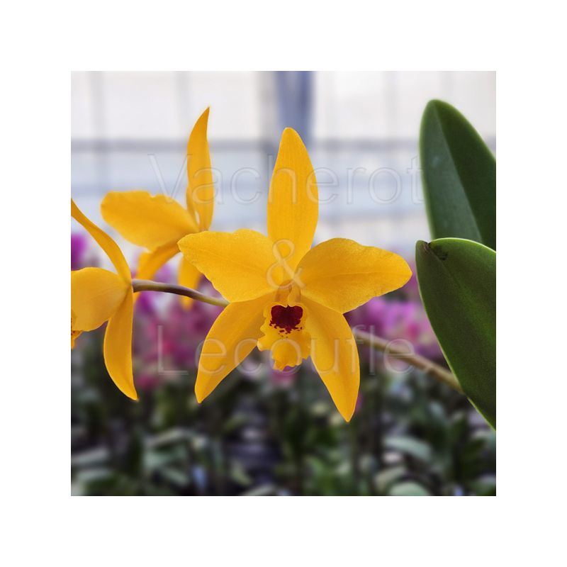 Bouquets de fleurs concolores orange vif. Labelle marqué de grenat. Hybride compact à la croissance vigoureuse.
