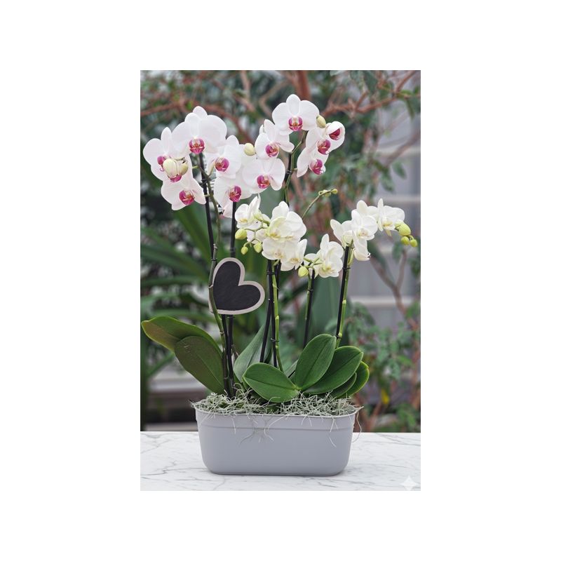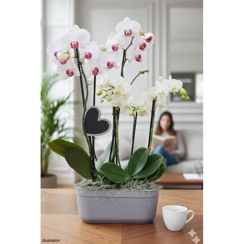 Installées dans un contenant élégant et durable, ces orchidées révèlent toute leur finesse et s’intègrent avec harmonie à chaque intérieur. Un accessoire en forme de cœur, complète l'ensemble d'une touche symbolique et raffinée. Laissez-nous par mail le court et tendre message que nous pourrons y inscrire si vous le souhaitez.