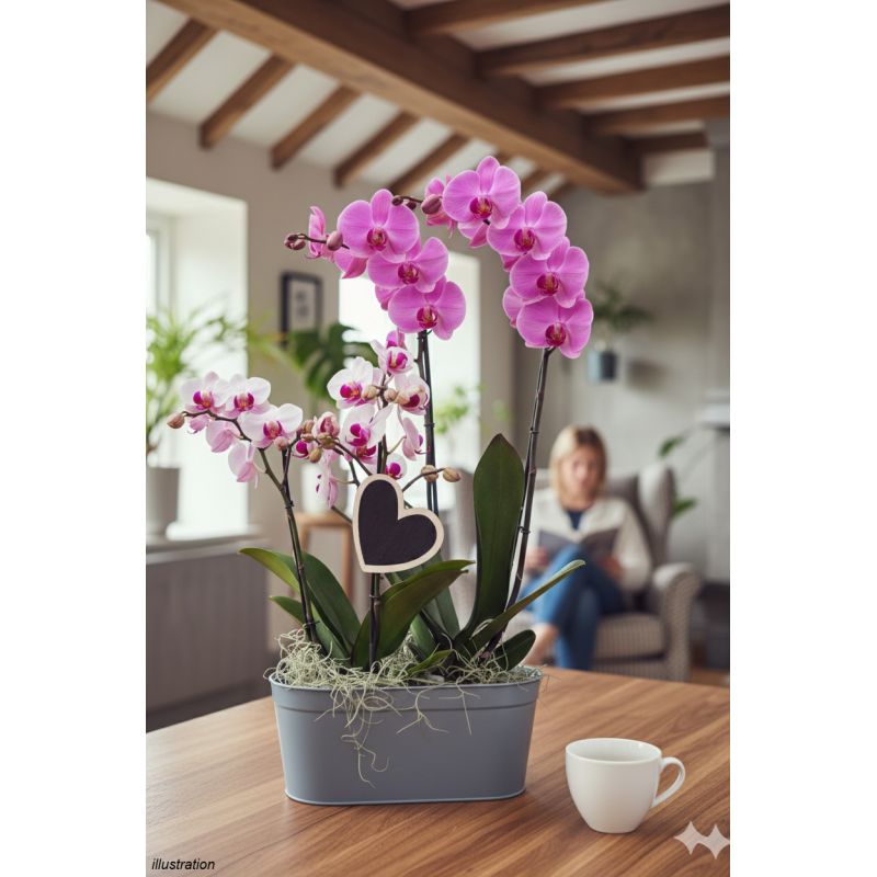 Présentées dans un contenant élégant, ces orchidées sont sublimées par un accessoire en forme de cœur, apportant une touche symbolique et raffinée à l’ensemble. Laissez-nous par mail le court et tendre message que nous pourrons y inscrire si vous le souhaitez.