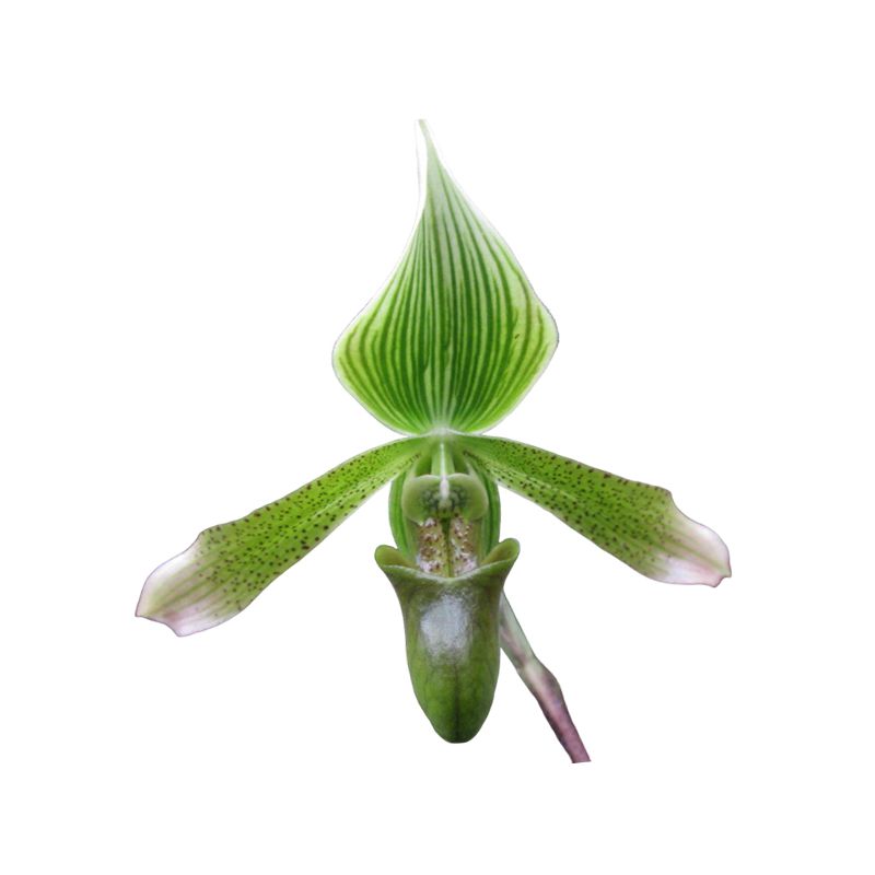 Fleur élancée à la tonalité majoritairement verte. Pavillon très fortement teinté de vert sur fond blanc strié de vert. Pétales verts pointillés. Labelle étroit brun..