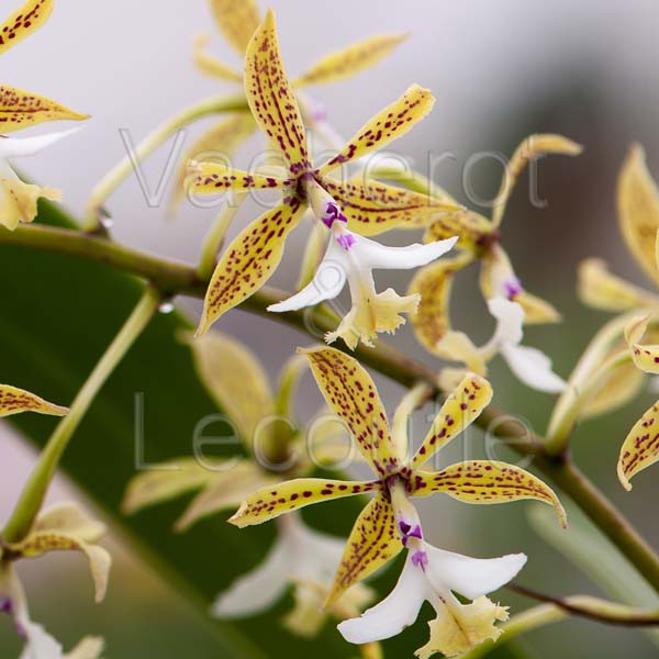 Grappe érigée puis retombante de fleurs cireuses étoilées, discrètement parfumées, de couleur jaune pâle éclaboussées de grenat. Labelle blanc marqué de violet et de jaune pâle.