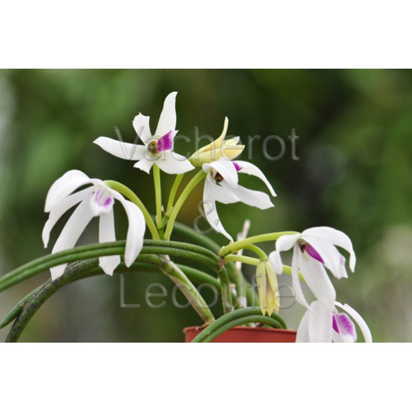 Orchidée miniature (10/12cm de haut) portant des pseudobulbes et des feuilles cylndriques. A la floraison, la plante est recouverte de petites fleurs parfumées de 4cm, blanches éclairée par un labelle lilas.