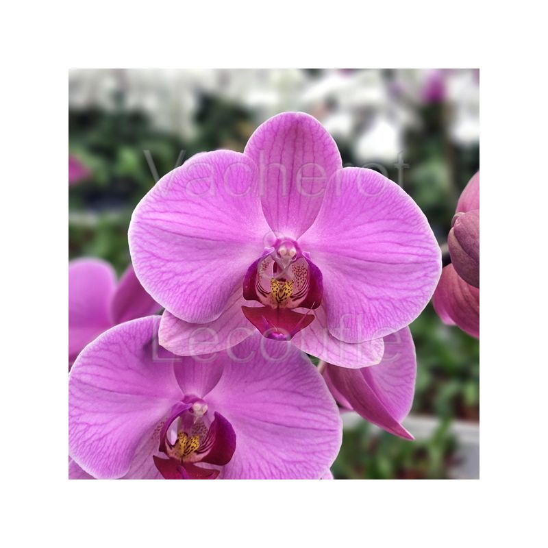 Grandes fleurs bien rondes à la délicate couleur rose mauve. Labelle grenat.