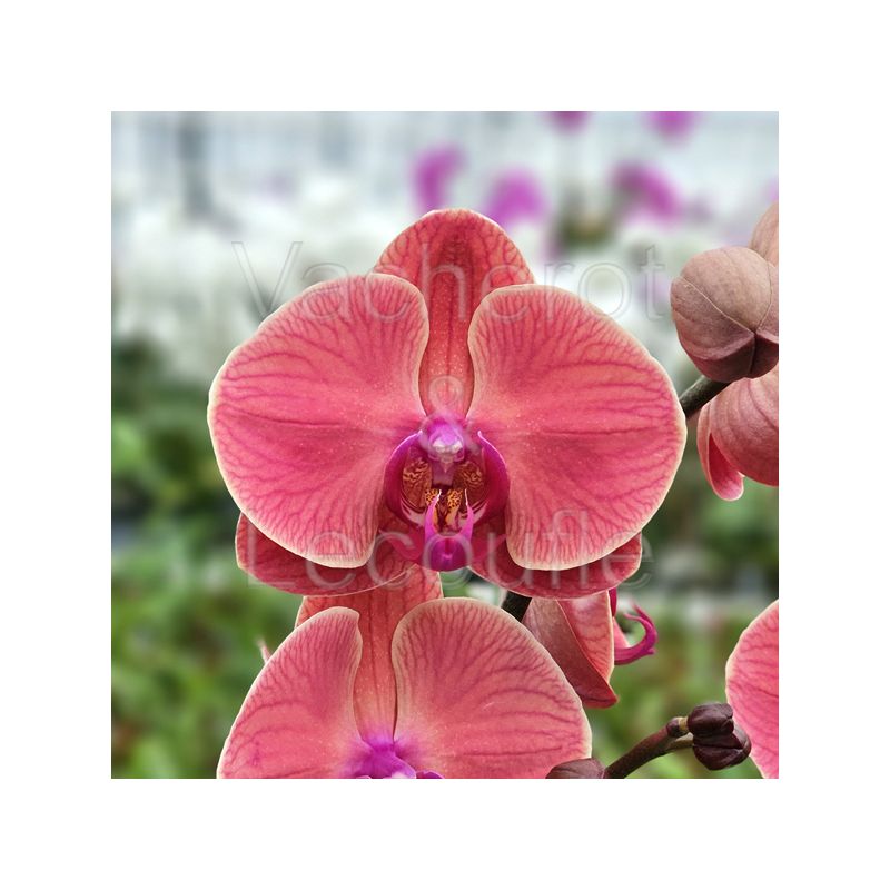Fleurs à la belle forme et d'une vibrante couleur rouge corail. Le coeur et le labelle sont fuchsia.