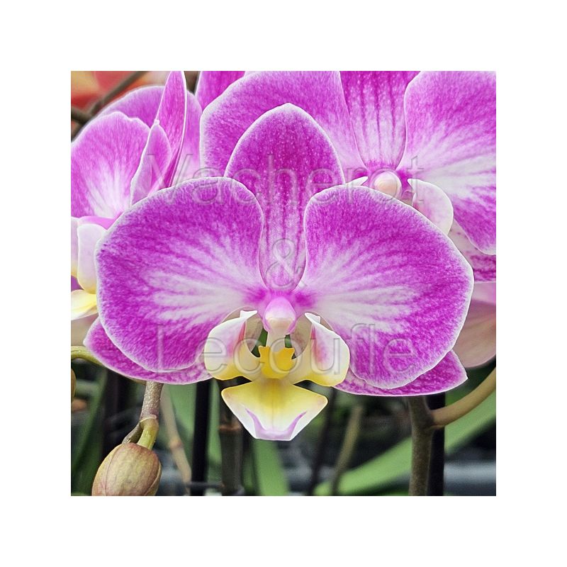 Tiges florales ramifiées. Belles fleurs rose vif au coeur éclairé de blanc. Labelle blanc éclairé de jaune pâle en son coeur.